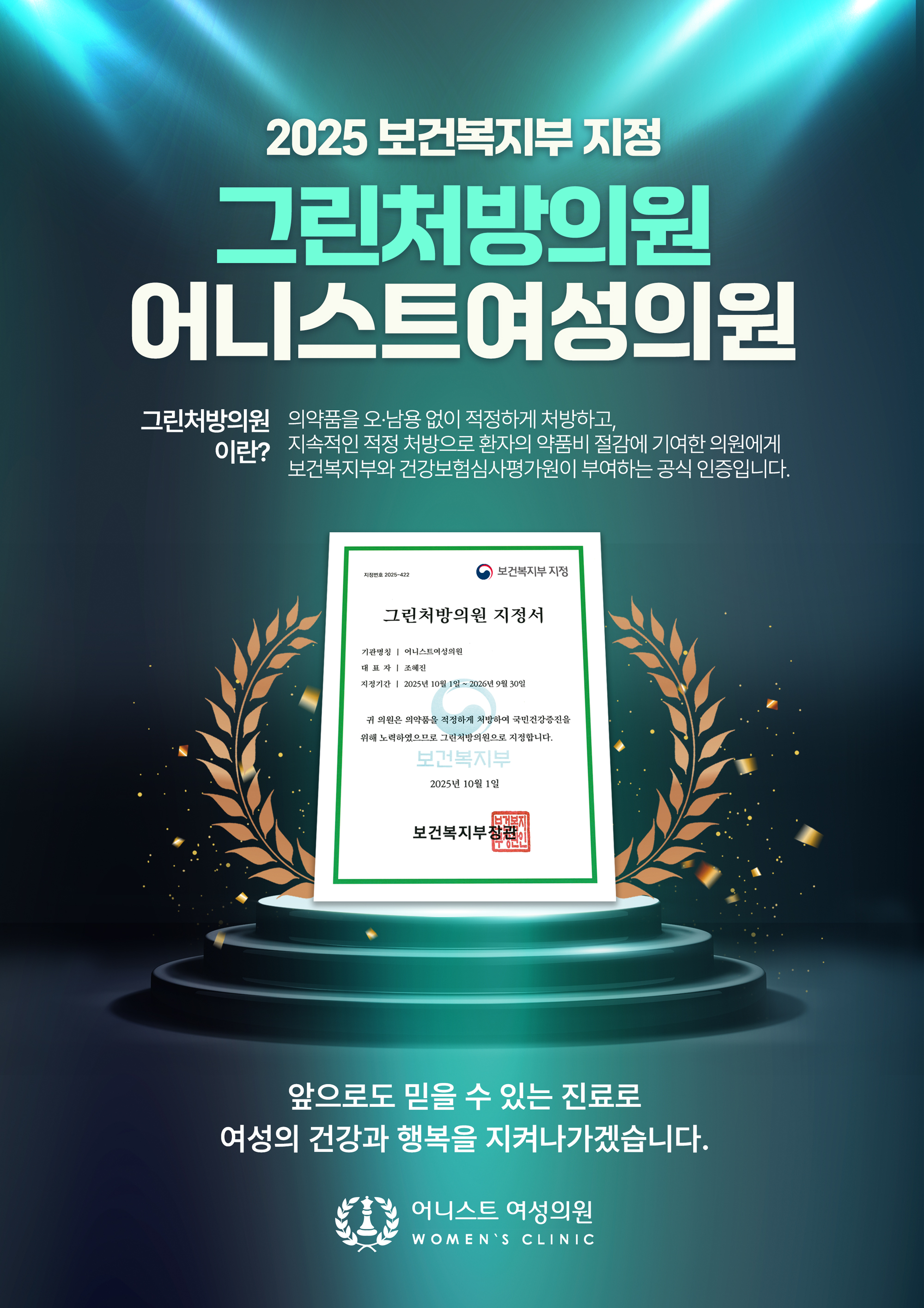 | 2025 보건복지부 지정 어니스트여성의원 '그린처방의원' 선정! | ||
