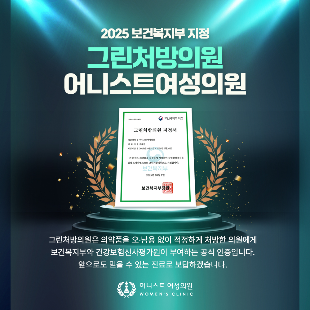 ![]() 여성의 건강과 아름다움을 최우선으로 생각하는 어니스트여성의원이 2025년 '보건복지부 지정 그린처방의원'으로 선정되었습니다!