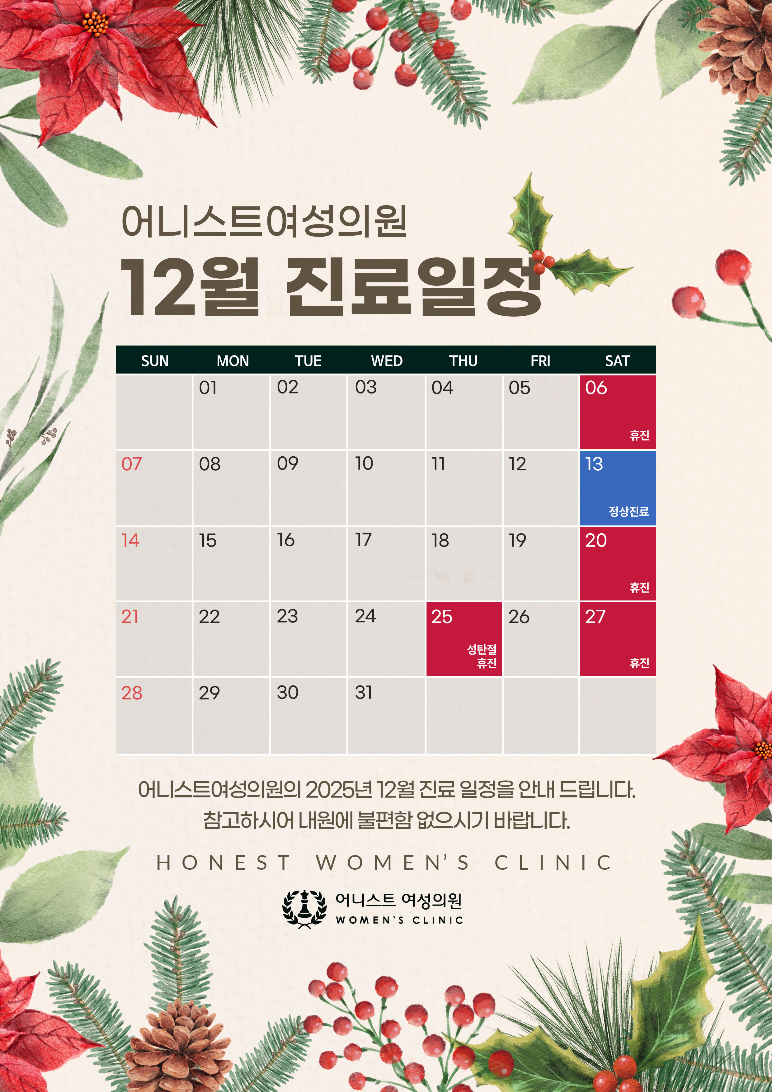 | 토요일 | AM 10:00 - PM 03:00 (점심시간 없음/2째주만 진료) |